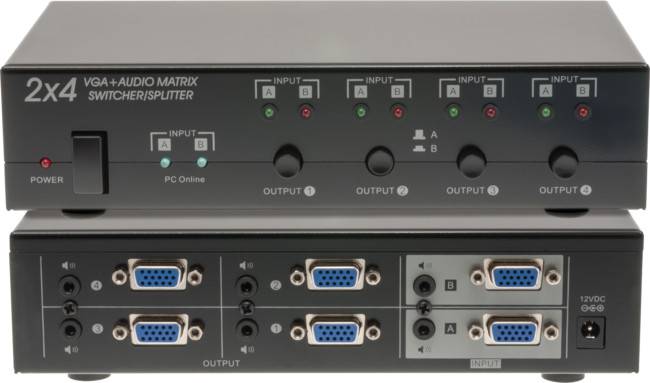 The PRO1338 VGA Matrix is perfect for larger installations where multiple displays or projectors are required. Each of the four outputs can independently displayeither of the two inputs. Perfect for classroom and demonstration rooms, conferences and houses of worship, and even restaurant or shop displays! Great for huge impact in large environments using up to 4x projectors or for small conference rooms where several small monitors can be used.