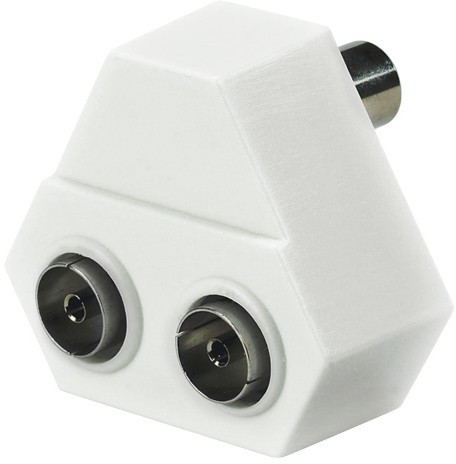 Right angle 2-Way 75 ohm coaxial splitter. Commonly used in wall sockets for TV, Video or FM tuner output.